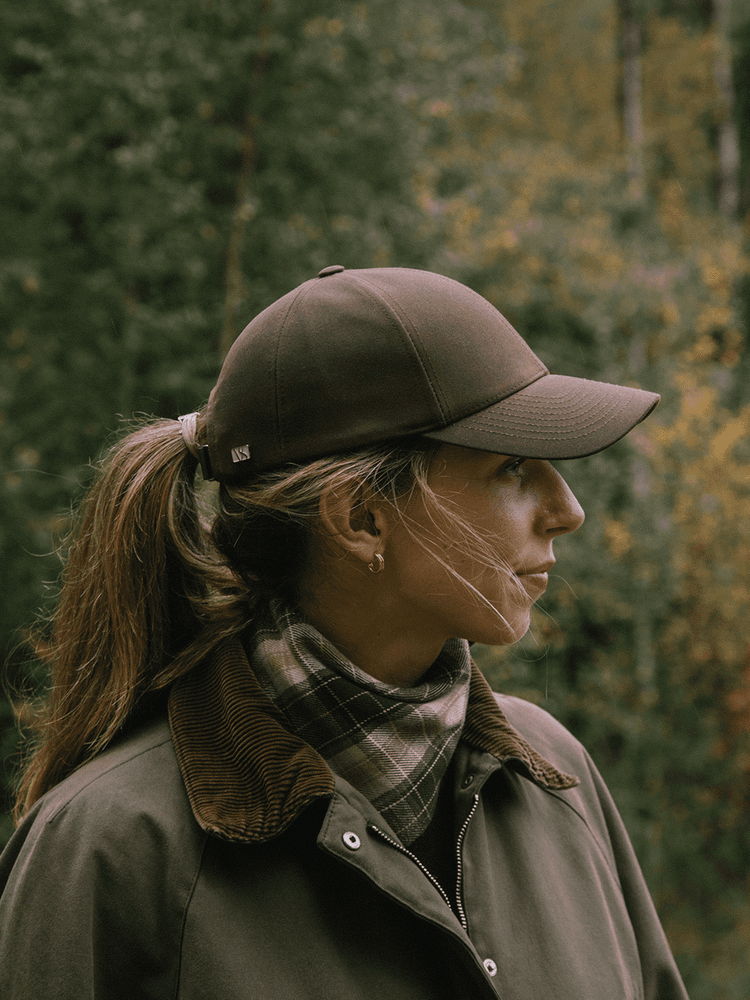Side view of female wearing a brown oilskin cap from Varsity Headwear in the woods in Norway